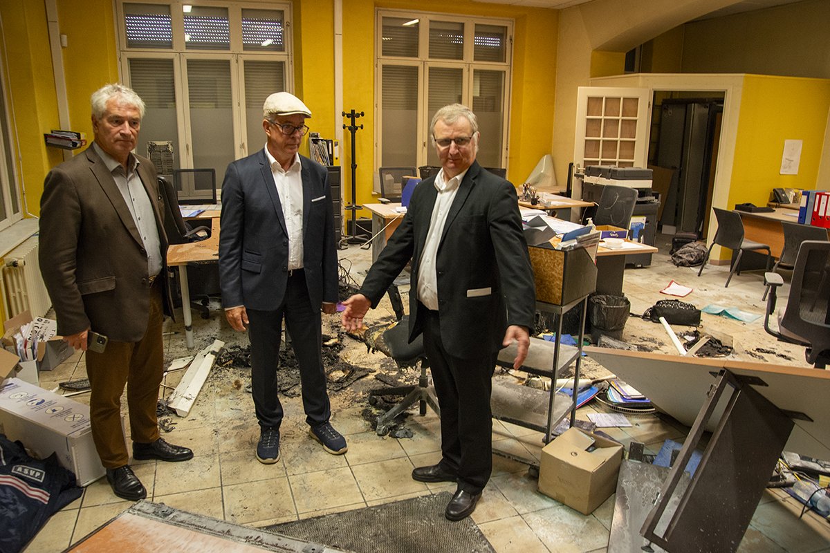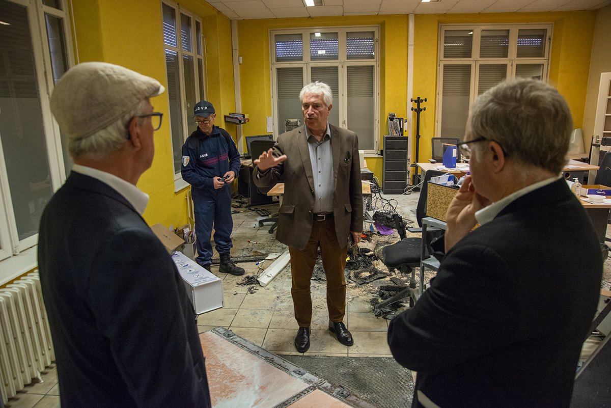 Accompagné d’Olivier JACQUIN, le Maire de Longwy s’est ensuite rendu dans les locaux de la police municipale, durement touchés par les violences urbaines qui se sont produites ce week-end afin de constater les dégâts.