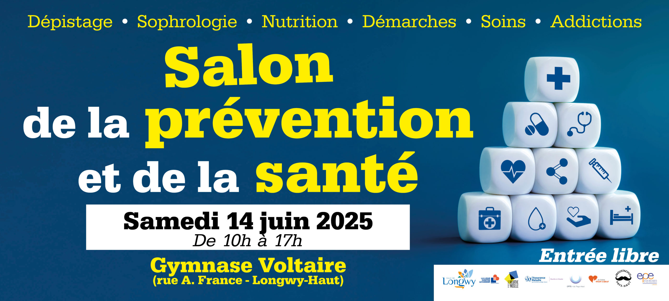 La santé et la prévention sont des enjeux majeurs de société. C’est pourquoi, le 14 juin 2025, la Ville de Longwy organise, en partenariat avec la Communauté Professionnelle Territoriale de Santé (CPTS) et d’autres acteurs locaux, un Salon de la Prévention et de la Santé, qui se déroulera dans la salle Voltaire.