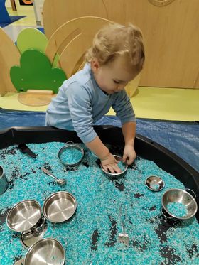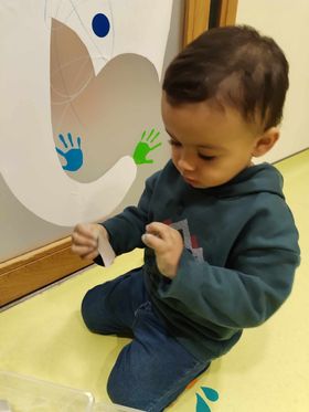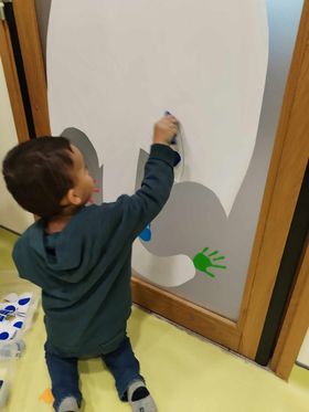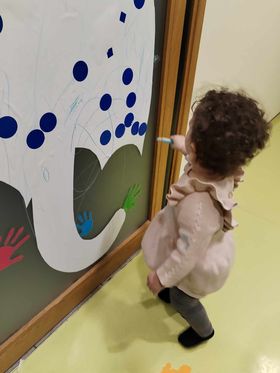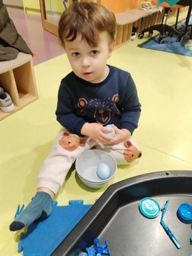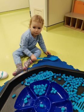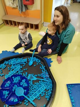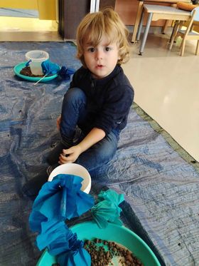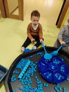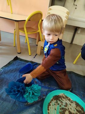 Aussi, les bambins présents ce jour-là étaient invités à arborer des vêtements bleus, et ils ont profité de nombreux ateliers autour de ce thème : atelier pâte a modeler bleue, plantation de fleurs bleues, graphisme et gommettes bleues sur un parapluie géant, atelier mousse bleue, ou encore un atelier manipulation riz bleu.