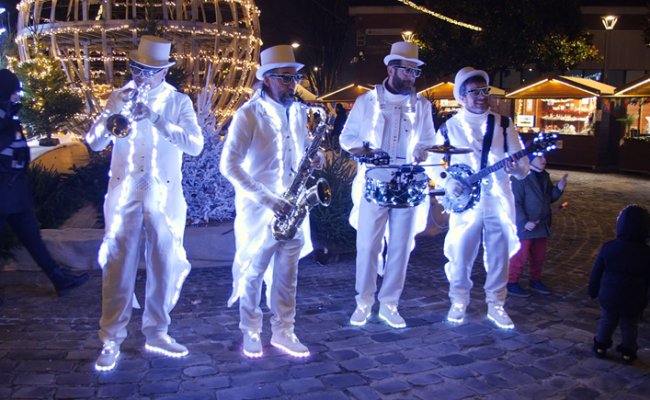 Né de la rencontre entre la Fanfare des Neiges et le Duo des Neiges, ce quartet propose une orchestration inspirée du jazz Nouvelle-Orléans, avec cuivres, banjo, percussions et chant. Vêtus de blanc étincelant et équipés d’instruments lumineux, ils illuminent littéralement la nuit avec leurs mélodies. Leur répertoire, à la fois classique (« Mon beau sapin », « White Christmas ») et résolument moderne (Mariah Carey, George Michael), est joué avec une touche festive et féerique. Leurs chapeaux scintillants et leurs chaussures lumineuses ajoutent une dimension visuelle envoûtante à leur performance.
