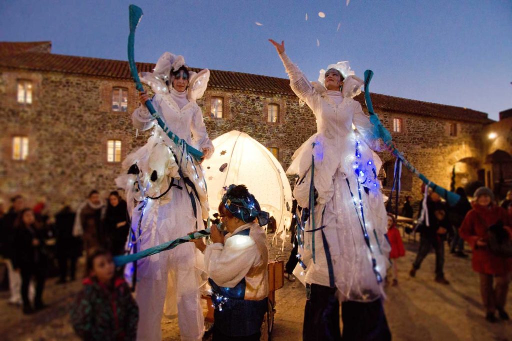 Ces artistes échassiers, venus du « pays des songes », dansent avec la nuit et répandent des poussières d’étoiles autour d’eux. Leurs costumes délicatement illuminés, évoquant planètes et constellations, créent une déambulation nocturne envoûtante.