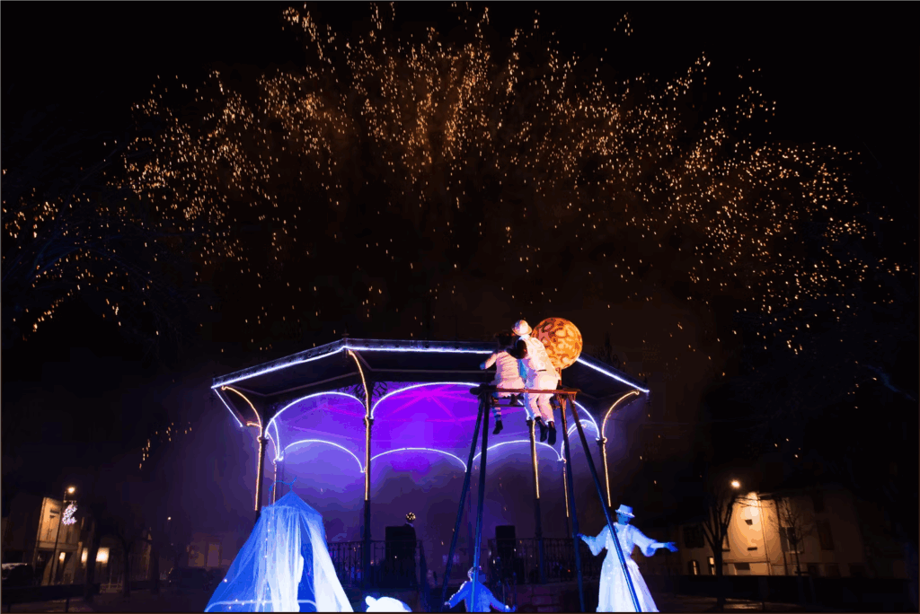 Ces artistes échassiers, venus du « pays des songes », dansent avec la nuit et répandent des poussières d’étoiles autour d’eux. Leurs costumes délicatement illuminés, évoquant planètes et constellations, créent une déambulation nocturne envoûtante.