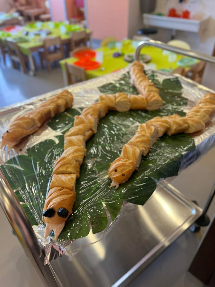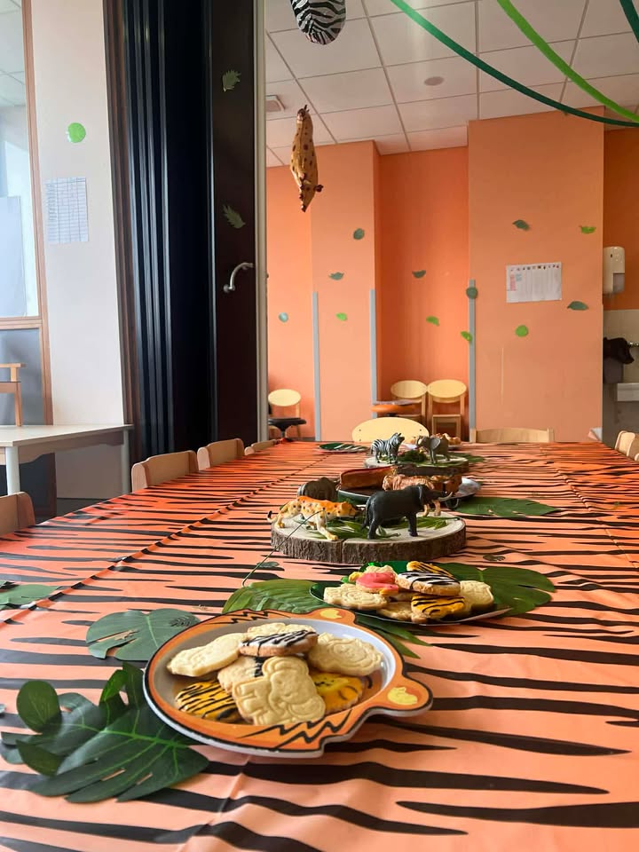 Comme le veut la tradition, la fête s’est terminée par un goûter gourmand sur le thème de la jungle. Les tables du réfectoire étaient décorées pour l’occasion et les enfants se sont régalés de biscuits décorés et de gâteaux en forme d’animaux exotiques : perroquets, serpents ou toucans.